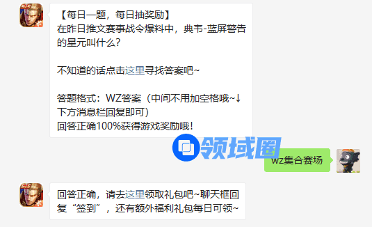 【每日一题,每日抽奖励】在昨日推文赛事战令爆料中,典韦-蓝屏警告的星元叫什么?不知道的话点击这里寻找答案吧~答题格式:WZ答案(中间不用加空格哦~↓下方消息栏回复即可)回答正确100%获得游戏奖励哦!