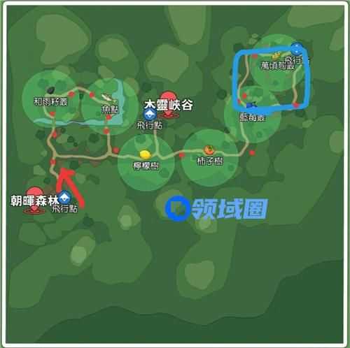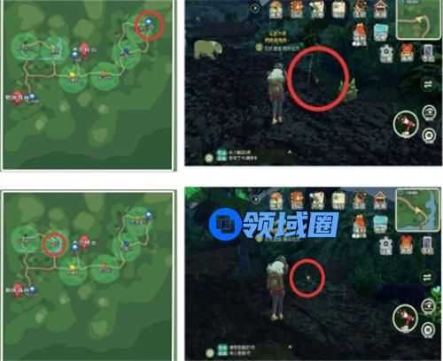月影密林最难刷的就是灯闪果,建议各位按照上图的红点顺序来刷,箭头那里采集五个和雨籽(下雨天才有),基本就能刷一个灯闪果。蓝莓的区域也是同理。