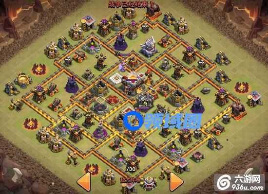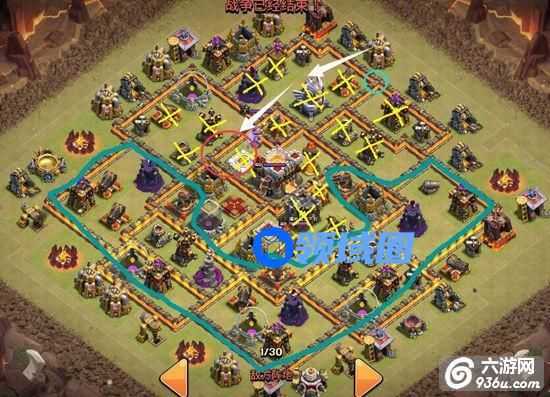 前戏干掉的建筑用黄色×覆盖。可以看出,利用闪电和地震以及双王。把整个阵型挖空了一块。让之后的狗球飞行范围大大减少,增加了战术的稳定性。 这里需要强调几个细节: