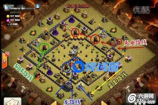 龙流负责灭掉对方女王,但是下龙的时机一定要把握好,主要配合天女推进的速度,如果等女王灭掉援兵拆掉设计路线上的防空塔再下龙很容易后戏时间不够。像这个阵型,其余防空塔距离女王教远,女王前面建筑较多,还有大本营、2个金库1个水库这种血量教厚的建筑,所以必须提前下龙。