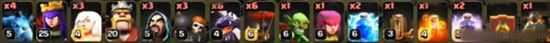 根据阵型特点,对方女王旁边有一个防空塔,药水配备2闪电1地震拆掉6点的防空塔,顺道带走相邻的一个空气炮。另外再配备两瓶狂暴药水,如果天女前戏教轻松就尽量节约狂暴药水,如果火力密集可以两个狂暴药水都下给天女,因为9点位置的防空塔比较靠外,附近防御建筑较少,所以即使零药水对后续的狗球部队影响并不大。