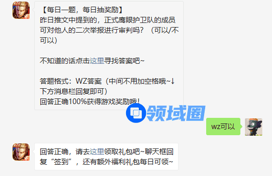 【每日一题,每日抽奖励】昨日推文中提到的,正式鹰眼护卫队的成员可对他人的二次举报进行审判吗?(可以/不可以)不知道的话点击这里寻找答案吧~答题格式:WZ答案(中间不用加空格哦~↓下方消息栏回复即可)回答正确100%获得游戏奖励哦!