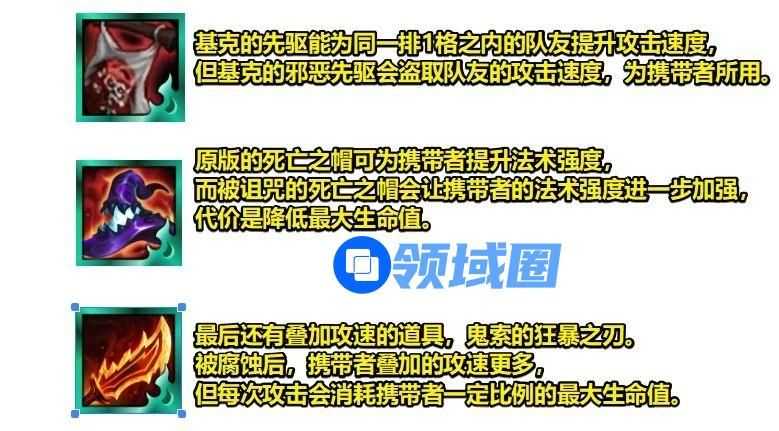 此装备需要占用全部3个物品栏位,在备战环节开始时,携带者会随机装备两个黑暗装备的成装。