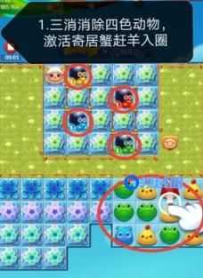 1:三消消除四色动物,激活上方同色寄居蟹赶羊入圈,寄居蟹攻击范围为九宫格八块区域,看咩咩羊位置进行消除同色动物。