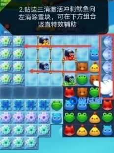 2:贴边三消激活冲刺鱿鱼,向左冲刺消除雪块和寄居蟹,可在冲刺鱿鱼下方组合竖直特效辅助。