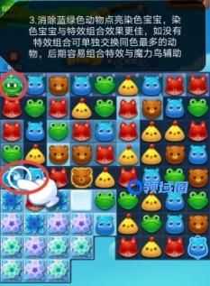 3:消除蓝色、绿色动物点亮染色宝宝,染色宝宝与特效进行交换最佳,大范围消除雪块,如没有特效交换,也可交换周边颜色较多的动物,后边容易组合特效与魔力鸟辅助消除。