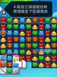 4:贴边三消或组合直线、爆炸特效消除左下角雪块。