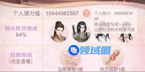 个人潜力值由个人势力和随从阵营加成决定。潜力值越高,削弱对方才艺值越多,获得的才艺分越高,获得的奖励越多。比拼时获得的金奖杯和银奖杯可在名士会中兑换指定的随从。