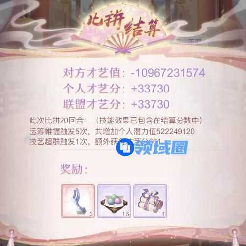 比拼是把所有潜力值消耗完以后结算,个人才艺分和联盟才艺分同样的,一共打20个回合。建议选择跳过战斗,不然看着火大。