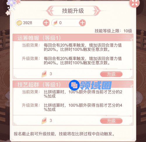 赛前准备时间内,可使用技能点升级技能,技能点不足时可使用金币购买,技能升级后将在比拼中自动触发。