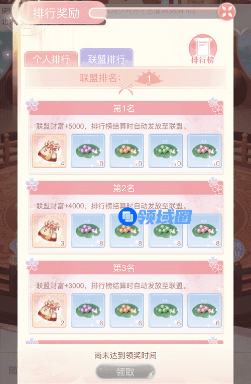 联盟排行奖励中包含联盟财富,联盟财富将在结算时自动发放至联盟,无需领取。此联盟财富为以联盟为单位增加的财富,不增加个人贡献值。