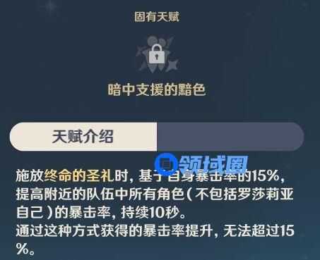 被动【暗中支援的黯色】能最多给予队友15%的暴击率加成,普通情况下一个60%暴击概率的罗莎莉亚能起到9%的暴击拐,说多不算多说少也还好。结合第一被动【聆听忏悔的的幽影】通过背后攻击触发12%暴击增幅后,该情况下能有10%左右的暴击拐辅助收益。