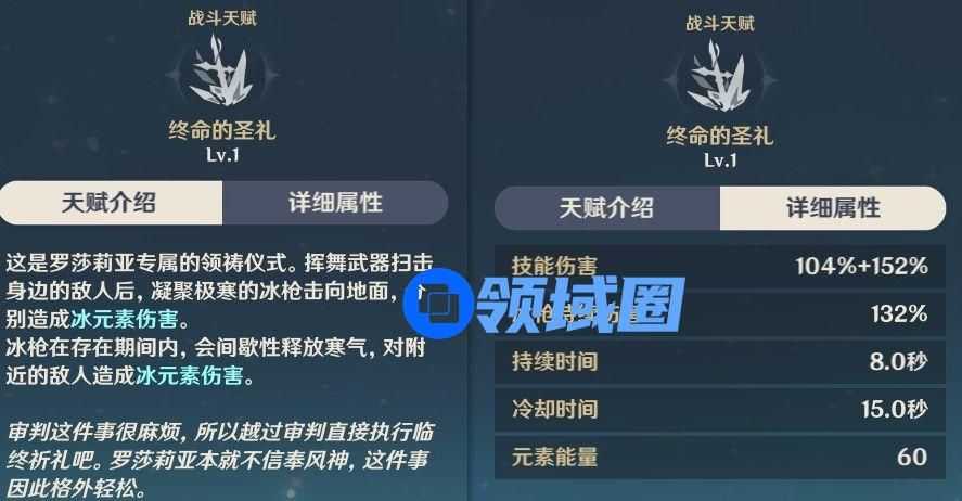 【终命的圣礼】使用时分为俩段伤害,背后攻击+冰枪撞击。再使用后冰枪会间歇性的向周围发动冰属性寒气攻击。只有再释放完【终命的圣礼】换人才能触发罗莎莉亚的第二被动暴击拐。