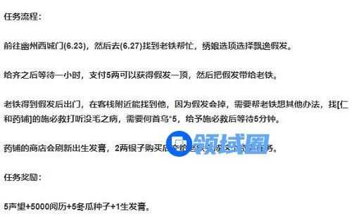 前往洛阳(17,17)的胭脂铺找莫掌柜打听,再去幽州(16,25)找绣娘,即可拿到假发 ,到手回来给木匠,等待15分钟。