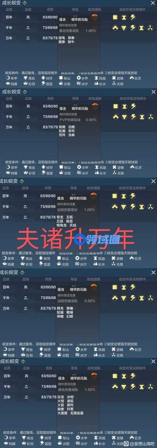 夫诸千年升万年,第一个千年印记和百年一样;第二个千年印记:旋龟、霸象、犀象、鲸牛。第一个百年印记:任意百年鹿、羚羊。第二个百年印记:鸡龙,任意蝙蝠,神雕,百年蝴蝶。