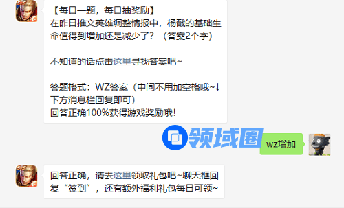 【每日一题,每日抽奖励】在昨日推文英雄调整情报中,杨戬的基础生命值得到增加还是减少了?(答案2个字)不知道的话点击这里寻找答案吧~答题格式:WZ答案(中间不用加空格哦~↓下方消息栏回复即可)回答正确100%获得游戏奖励哦!