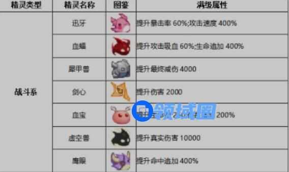 战斗系精灵能提供有对基础战斗属性有增益的,如吸血、暴击率、减伤等。