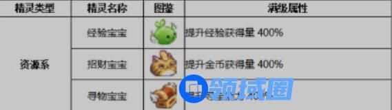 资源系精灵能提供高额的资源获取量,包括金币、经验、掉落品质三种。