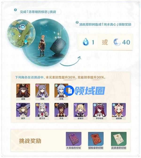 特定角色在挑战中,水元素抗性和元素充能效率都将有所提升。