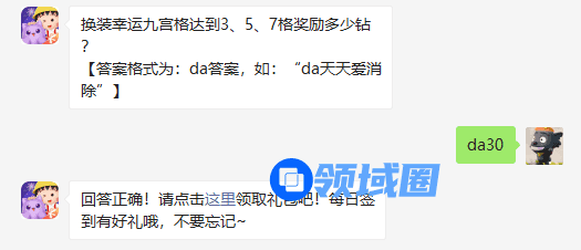 换装幸运九宫格达到3、5、7格奖励多少钻?【答案格式为:da答案,如:“da天天爱消除”】这是天天爱消除4月8日每日一题,游戏宝小编为您带来正确答案。