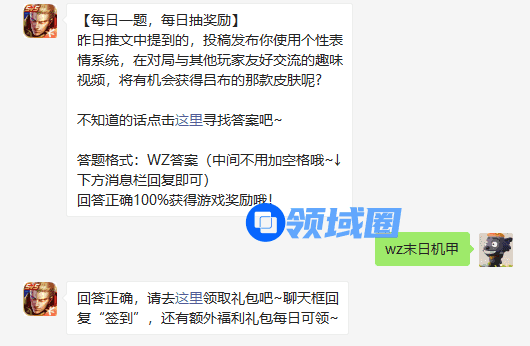 【每日一题,每日抽奖励】昨日推文中提到的,投稿发布你使用个性表情系统,在对局与其他玩家友好交流的趣味视频,将有机会获得吕布的那款皮肤呢?不知道的话点击这里寻找答案吧~答题格式:WZ答案(中间不用加空格哦~↓下方消息栏回复即可)回答正确100%获得游戏奖励哦!