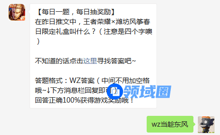 【每日一题,每日抽奖励】在昨日推文中,王者荣耀×潍坊风筝春日限定礼盒叫什么?(注意是四个字噢)不知道的话点击这里寻找答案吧~答题格式:WZ答案(中间不用加空格哦~↓下方消息栏回复即可)回答正确100%获得游戏奖励哦!