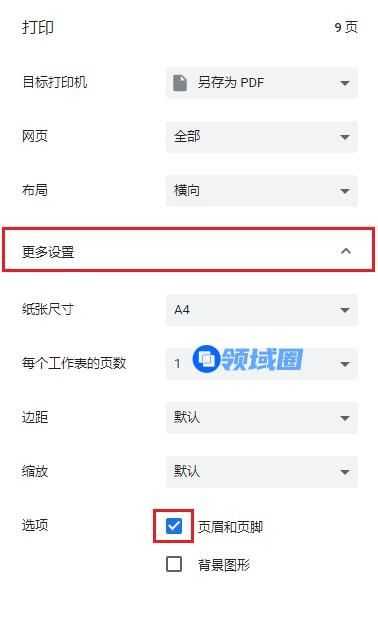3、在页面右方找到并展开“更多设置”选项;2. 在新弹出的界面中,选中“页眉和页脚”项目即可完成操作。