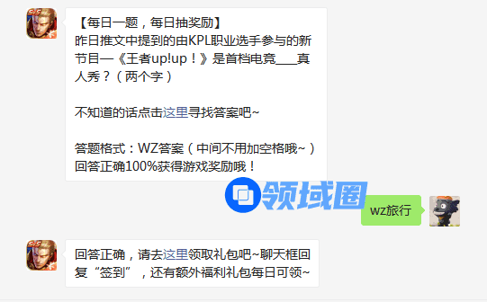 【每日一题,每日抽奖励】昨日推文中提到的由KPL职业选手参与的新节目—《王者up!up!》是首档电竞____真人秀?(两个字)不知道的话点击这里寻找答案吧~答题格式:WZ答案(中间不用加空格哦~)回答正确100%获得游戏奖励哦!