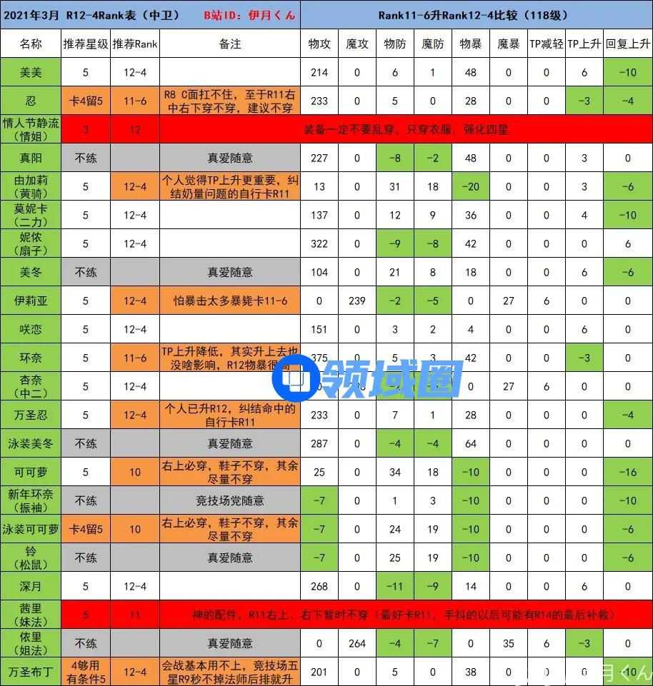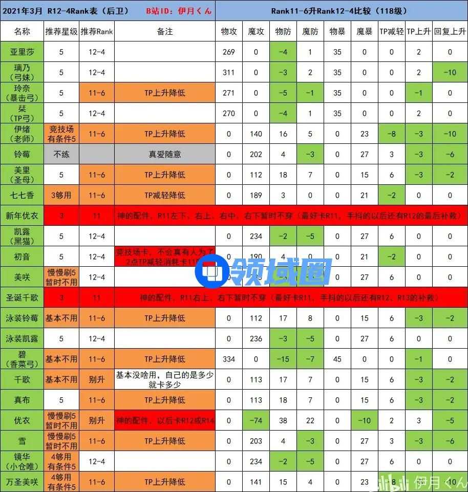表格进行的是R11-6与R12-4的对比,关键卡不需要看对比,红色字体已经标出。