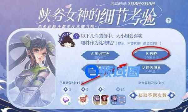 以下几件装备中,大小姐会喜欢哪件作为礼物呢?提示:不要犹豫!选最贵的!这是王者荣耀峡谷女神的细节考验第13题,游戏宝小编为您带来以下几件装备中大小姐会喜欢哪件作为礼物呢答案分享。