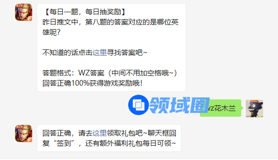 【每日一题,每日抽奖励】昨日推文中,第八题的答案对应的是哪位英雄呢?不知道的话点击这里寻找答案吧~答题格式:WZ答案(中间不用加空格哦~)回答正确100%获得游戏奖励哦!