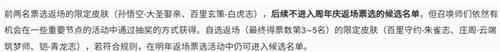 首先大圣娶亲从上一次直售返场开始,就被官方划入【不会直售返场的皮肤名单】,并且20年的周年庆返场皮肤中,就包括了大圣娶亲,大圣娶亲后续也不会加入周年庆返场皮肤投票。