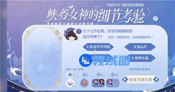 以下几件礼物,你觉得嫦娥姐姐最喜欢哪个?这是峡谷女神的细节考验活动中题目之一,因此很多玩家想知道王者荣耀嫦娥姐姐最喜欢哪个礼物?游戏宝小编为您带来王者荣耀嫦娥姐姐最喜欢哪个礼物答案选项。