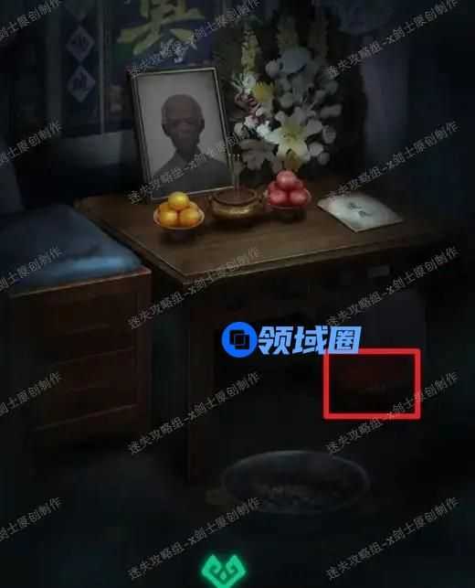11、来到四楼大爷的遗像前,点击遗像,点开最上面的苹果,就会发现苹果尾部有一个红色的针,得到红色指针。50.1.2