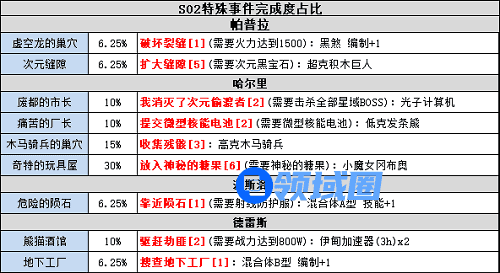 举个例子: 表里有废都的市长事件,说明这个事件是会影响到S02进度100%的特殊事件。后边标记的我消灭了次元偷渡者[2],说明需要在2次时空域的周期里,成功的完成2次我消灭了次元偷渡者 。