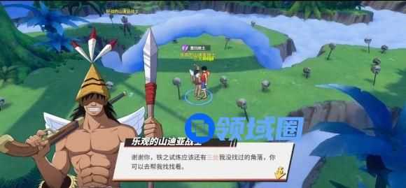 我们从码头这个位置往中心走去,在这里会有一个NPC“乐观的山迪亚战士”,而在它的前面会有一个探索区域。探索可以获取特殊物品,这在后面会使用到。