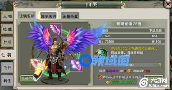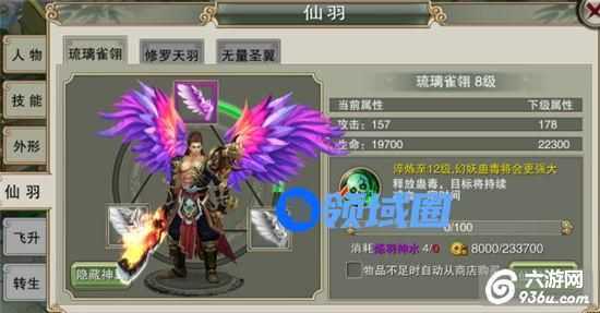 仙羽开启后可通过消耗道具,提升仙羽的等级。每种仙羽在达到6级后,将开启专属被动技能,被动技能的效果十分强大,并且不占用技能栏。