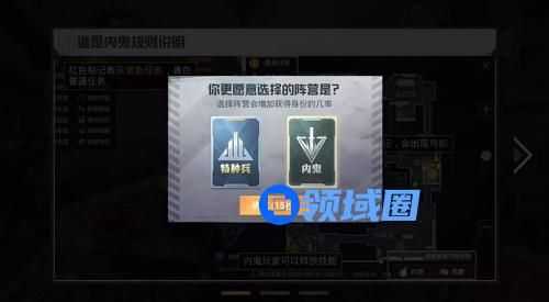 游戏中玩家需要扮演特种兵或内鬼两种身份,玩家主动选择想要的身份倾向,可以增加获得该身份的几率。