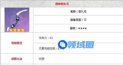 祭礼弓装备类型是弓,属于四星级别的武器,攻击力是42,元素充能效率是6.7%。