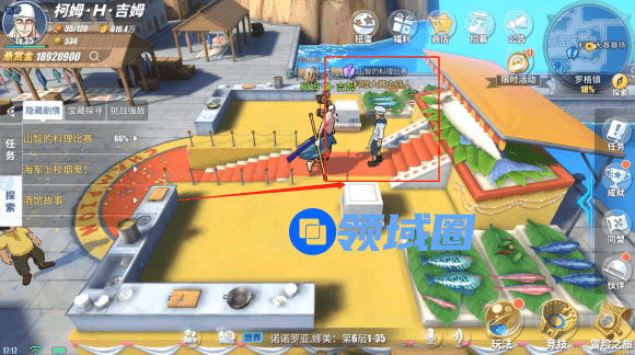 来到鱼店老板后方的右边找到渔夫,看到了山治梦寐以求的(象鼻金枪鱼),问渔夫怎么卖,渔夫说参加比赛拿冠军,说着说着就去旁边赛场报名参加比赛了。