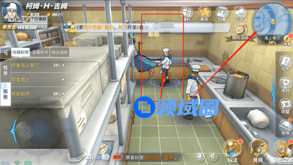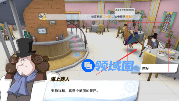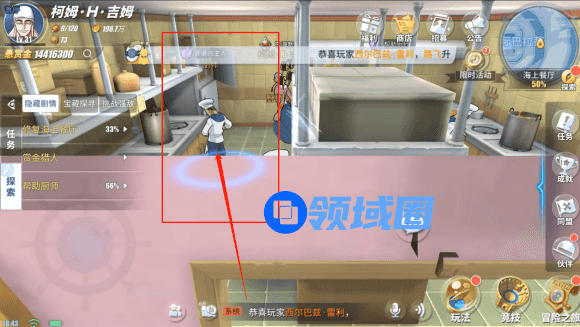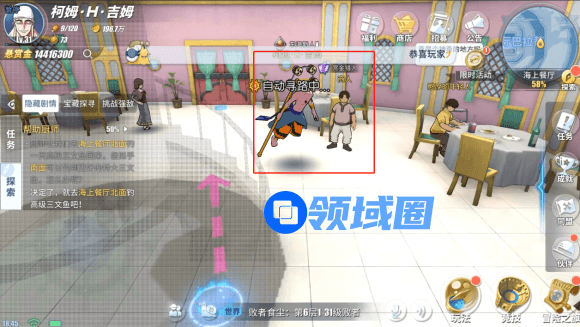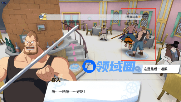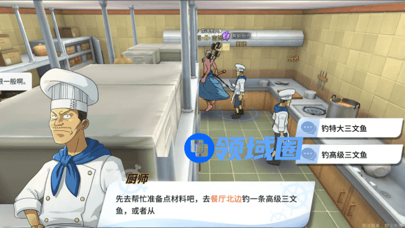来到北面海上直接钓,一发入魂,钓完返回餐厅2楼厨房内部去找厨师,厨师叫你去楼下给客人上最后一道菜,顺便“正当”收费,一定要正当的那种!正道的光照在了餐厅内,你完成了【帮助厨师】任务。