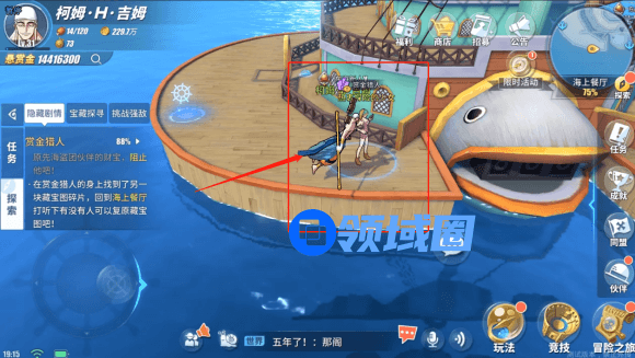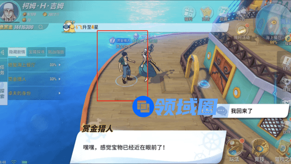 随后进入餐厅内部1楼,和两个路人沟通一波,沟通完后返回外面甲板找赏金猎人,被要求去北面海域一探究竟。