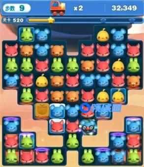 2、消除了木箱以后,上方区域的空间较为完整。在收集这区域内的两列小火车的同时,我们可以顺便连取一些特殊棋子,利用特殊棋子去攻击下方较小的区域,来收集较小区域的小火车,或改变棋子布局,获得就近消除的机会。