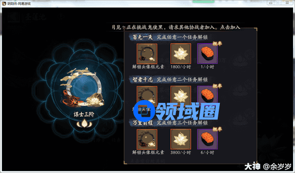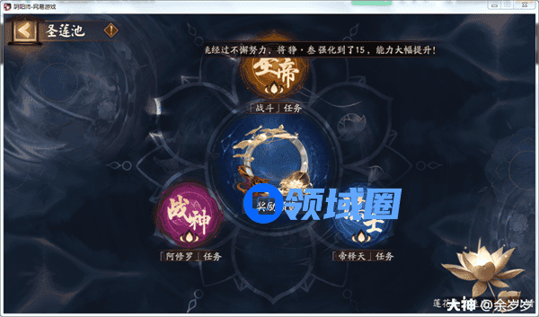 圣莲池的任务通过鬼域讨伐来达成,关系到头像框奖励的解锁。