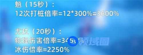 首先0命优菈常规输出20秒,可打出3450%物理伤害+2250%冰元素伤害。横向对比魈开大后15秒的打桩伤害(3600%伤害倍率),可以发现优菈20秒内的常规输出伤害,近似于全程开大的魈,这还未算上优菈的大招圣剑伤害。