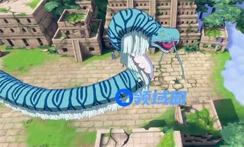 来到古代遗迹的内部,然后可以来到通往地表遗迹的这个传送点的下面一点点,就可以看到这个小孩,与之对话,然后可以触发这个蓝色的巨蟒出现的动画。