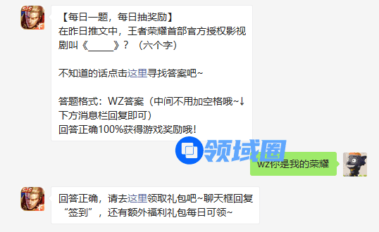【每日一题,每日抽奖励】在昨日推文中,王者荣耀首部官方授权影视剧叫《______》?(六个字)不知道的话点击这里寻找答案吧~答题格式:WZ答案(中间不用加空格哦~↓下方消息栏回复即可)回答正确100%获得游戏奖励哦!