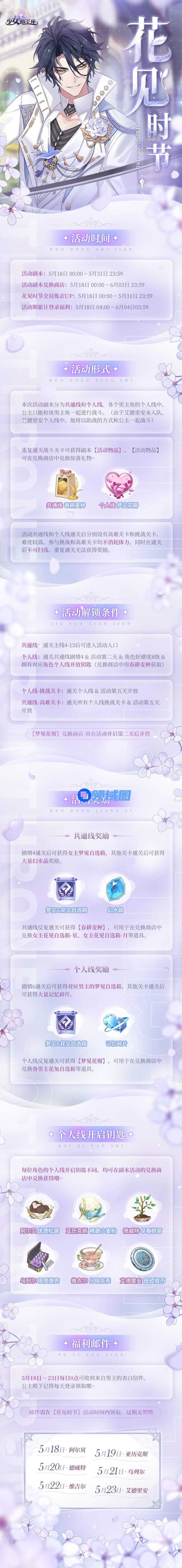 公主殿下们的春季约会来啦,花见日赠礼:5月18日活动开启当天阿官将给各位公主殿下通过邮件发送【幻水晶*520】;另外活动期间每日登录游戏还有签到好礼哦~