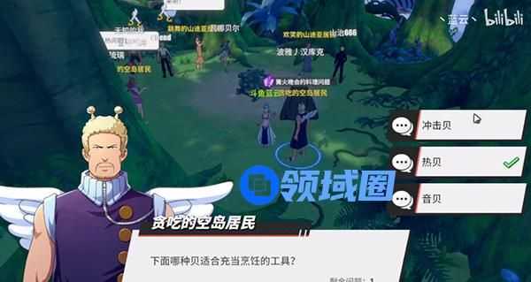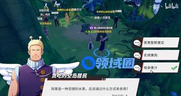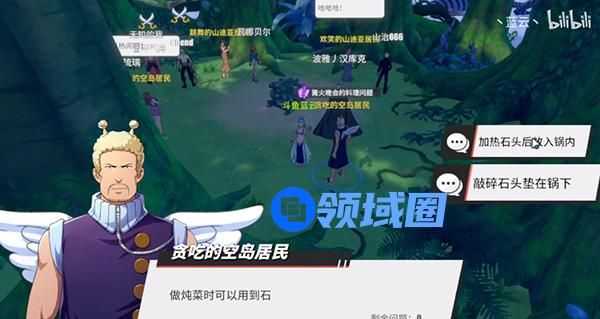 7、篝火晚会的料理问题:打开地图来到活祭品祭坛后边,然后找到贪吃的空岛居民回答三个问题,答案分别是吸食果汁、热贝、加热石头后放入锅内。