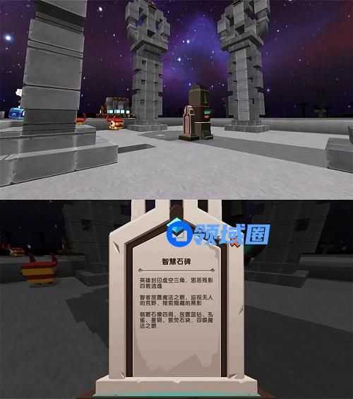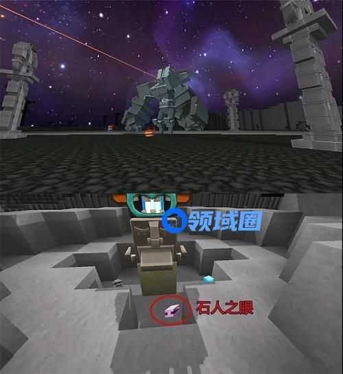 通过星站来到萌眼星,根据指示找到了萌眼石像,而智慧石碑也指示说要在石像四周放置蓝钻、孔雀、星铜、紫荧石块召唤魔法之眼。